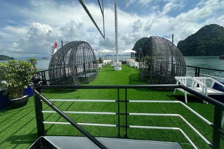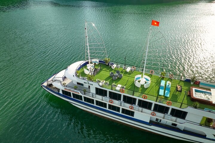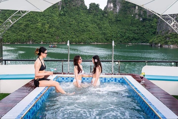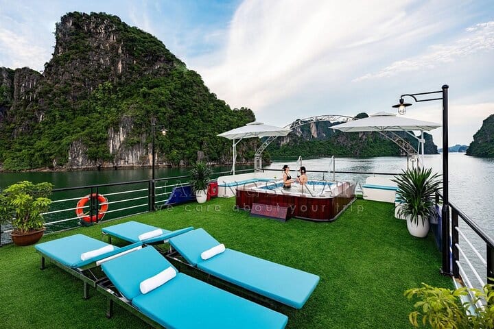 Experience a luxurious full-day cruise through the breathtaking landscapes of Halong Bay. Savor a buffet lunch featuring authentic Vietnamese cuisine and fresh seafood while sailing past iconic limestone islets. Explore the famous Surprising Cave, kayak or ride a bamboo boat through the serene Luon Cave lagoon, and relax or hike to the panoramic viewpoint on Titov Island. Conclude the day with a sunset party on the sundeck, complete with live music, fresh fruit, and sweet treats—offering an unforgettable blend of natural beauty, cultural charm, and premium comfort.