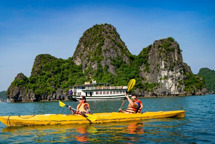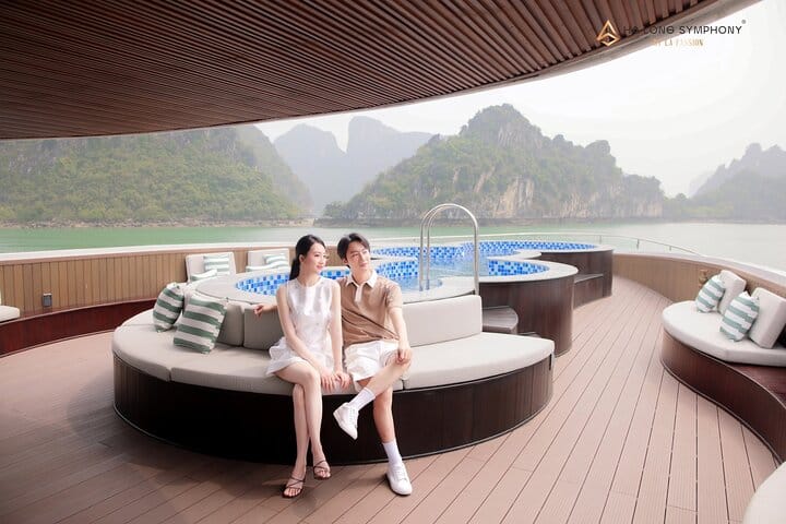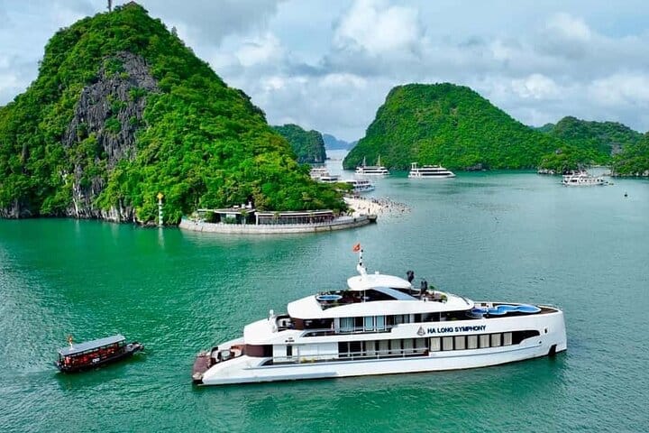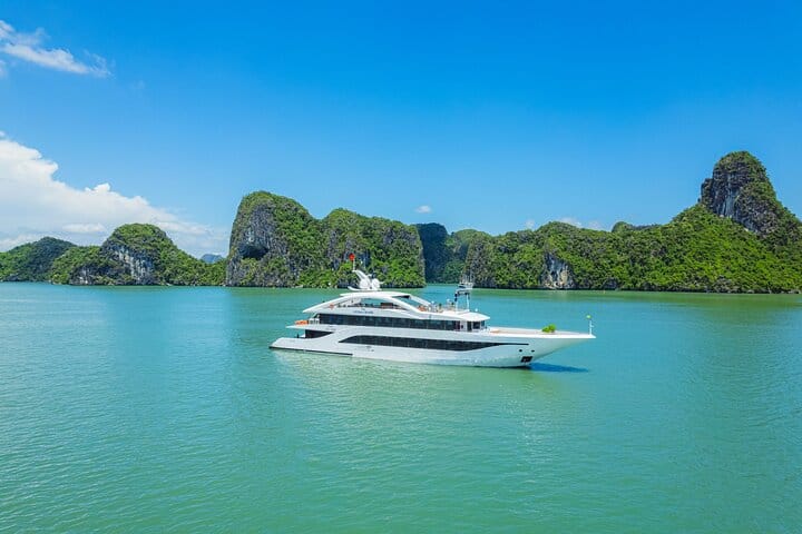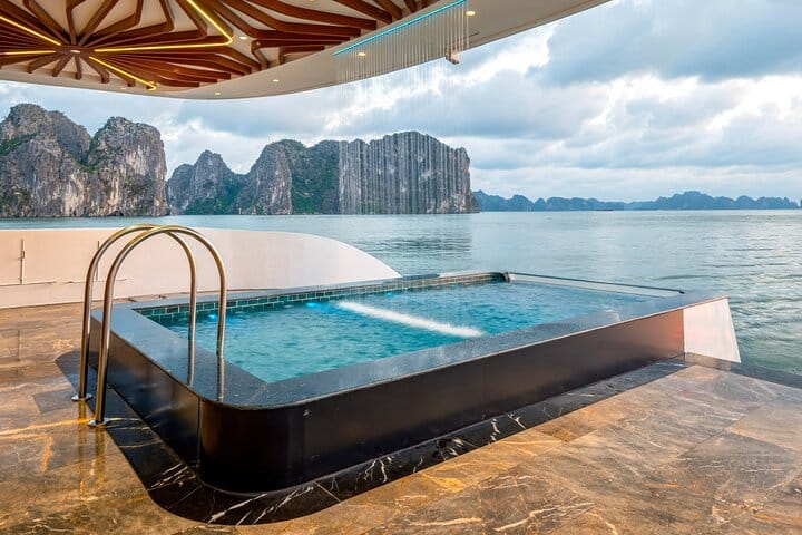 Experience the ultimate 5-star Halong Bay day cruise departing from Halong International Cruise Port, featuring a private Jacuzzi and a sumptuous lunch onboard. Discover the breathtaking beauty of Sung Sot (Surprise) Cave, relax on the pristine sands of Titov Island, and enjoy a leisurely cruise through Halong Bay’s stunning limestone landscapes. Savor gourmet Asian and Western cuisine while soaking in the views, making this all-inclusive tour the perfect combination of luxury, sightseeing, and relaxation for an unforgettable Halong Bay experience.