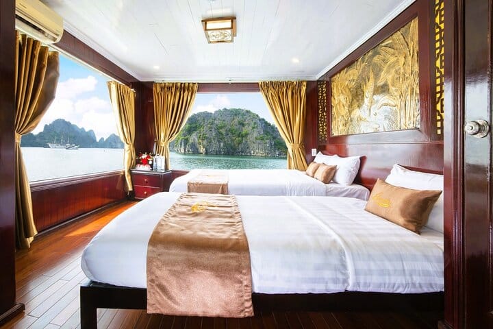 While Halong Bay has become crowded with mass tourism at popular spots like Titov Island and Sung Sot (Amazing) Cave, Bai Tu Long Bay offers a quieter and more pristine alternative, located to the northeast of Halong Bay. Known as “the Bay of Dragon Children,” Bai Tu Long Bay is equally spectacular—if not more natural and serene—making it a rising must-visit destination for travelers worldwide. Renea Cruise, a boutique cruise in Bai Tu Long Bay, features traditional wooden boats for small groups, cozy en-suite cabins with large windows, kayaking among limestone islands, and authentic Vietnamese cuisine, delivering a truly off-the-beaten-track cruise experience.