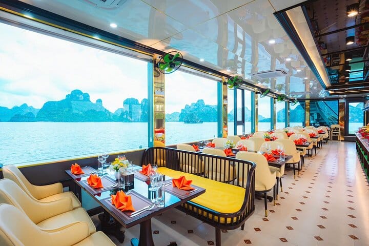 Embark on a luxury day cruise to Halong Bay, a UNESCO World Heritage Site, aboard the 5-star Sky Cruise. Travel comfortably from Hanoi via the modern expressway, relax on the sundeck or in the open-air Jacuzzi, and cruise past stunning limestone karsts and emerald waters. Enjoy a lavish buffet lunch featuring fresh seafood and Vietnamese specialties, explore caves, kayak or take bamboo boat rides, and admire panoramic views from Titov Island. With professional service and a stylish setting, this all-inclusive tour perfectly combines comfort, adventure, and the natural beauty of Halong Bay.