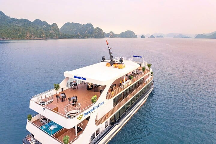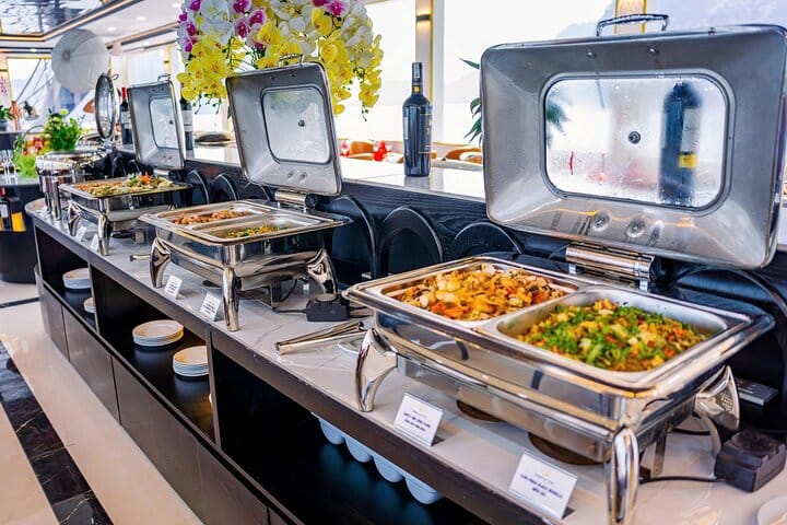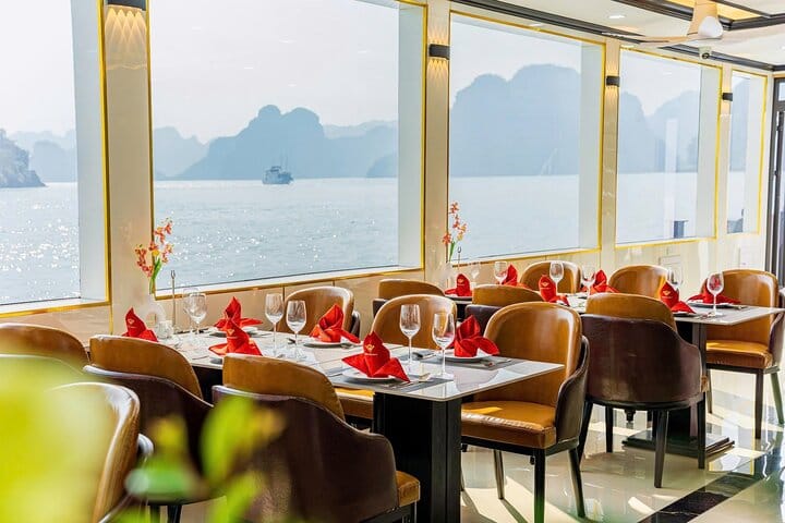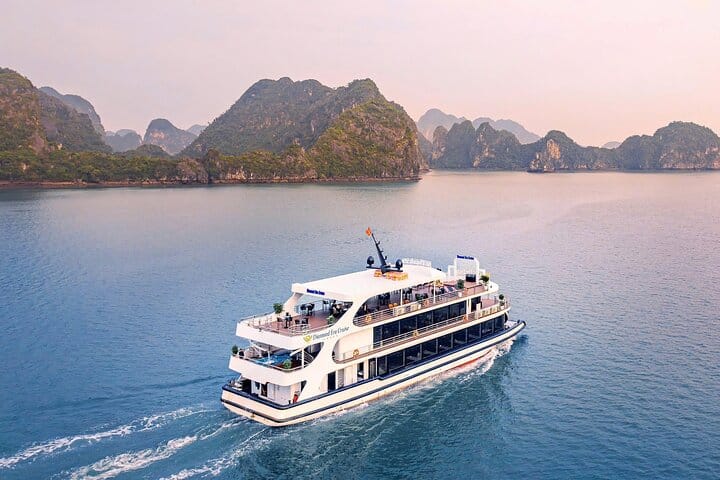 This luxury 5-star cruise offers an exceptional experience in the heart of Halong Bay, a UNESCO World Heritage site known for its breathtaking limestone seascape. Designed with a modern three-deck layout and spacious, elegant interiors accommodating up to 115 guests, it is ideal for premium day trips and private events. Guests can enjoy a diverse lunch selection, including Indian set menu, buffet, vegetarian dishes, seafood, and Vietnamese cuisine. The package includes all entrance fees, covering Sung Sot Cave, Titop Island, and kayaking or bamboo boat at Luon Cave for a complete Halong Bay day tour experience.
