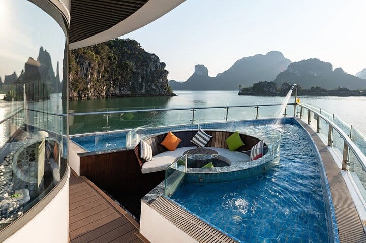 Embark on a 7.5-hour luxury day cruise through Ha Long Bay and Lan Ha Bay. Enjoy a buffet lunch with panoramic views of Ha Long Bay’s iconic limestone islands. Explore the Dark and Bright Cave by bamboo boat, kayak in the crystal-clear waters of Lan Ha Bay, and swim in this serene paradise. Participate in a hands-on cooking class to make traditional Vietnamese spring rolls. Finish the day with a sunset party on the sundeck, taking in breathtaking views. The tour includes hotel pick-up either in Hanoi or Ha Long, transfer to Tuan Chau Marina, and return after the cruise. Book your luxury cruise for an unforgettable adventure full of culture, relaxation, and natural beauty.