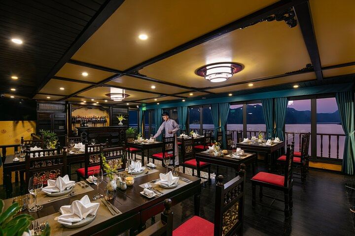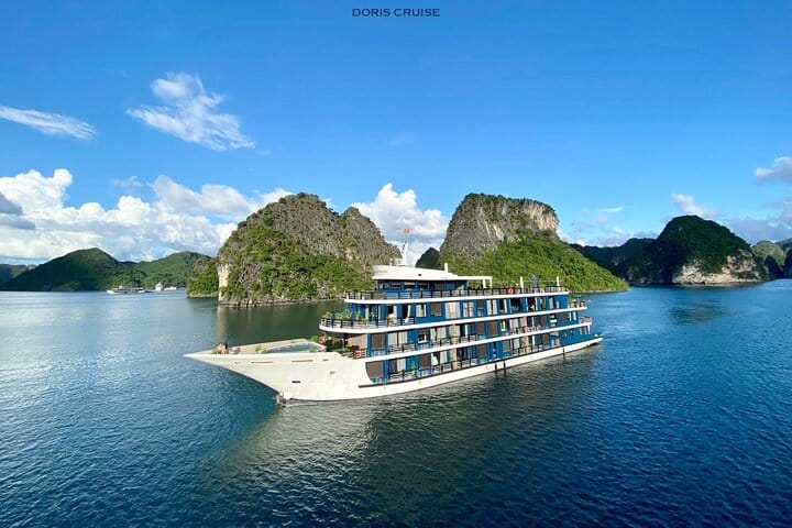 Doris Cruise is a newly launched 5-star luxury cruise, renowned as the first in the region to feature a swimming pool onboard. All cabins offer private balconies with stunning ocean views, providing guests with an exclusive and comfortable experience. The cruise offers unique itineraries that explore the original and less crowded Lan Ha Bay alongside the iconic Halong Bay. Departing from Hanoi with convenient transfers, passengers can enjoy marvelous destinations including Ba Trai Dao Islet for swimming and kayaking, Dark & Bright Cave (Hang Sang & Toi), Con Vit Islet (Duck Islet), Thumb Islet, and Gia Luan Harbor. Discover breathtaking blue waters under golden sunshine on this unforgettable journey.