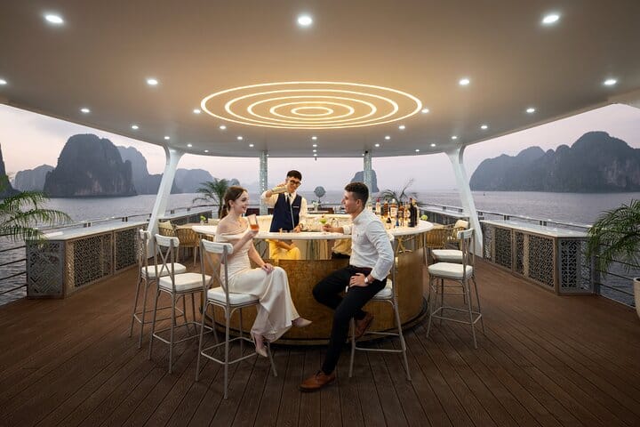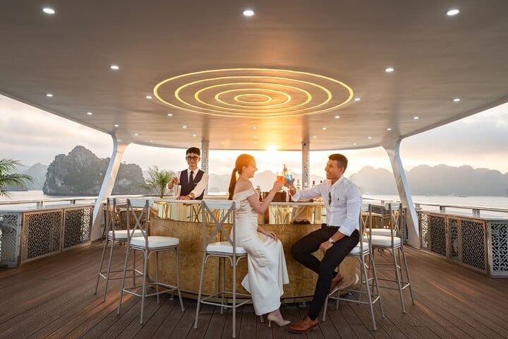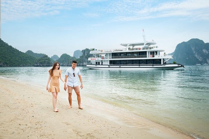 Begin your journey at Tuan Chau International Marina, cruising through the iconic limestone karsts of Ha Long Bay. Discover Sung Sot (Surprising) Cave, famous for its spectacular stalactites and impressive rock formations, then continue to Titov Island for kayaking at Luon Cave, swimming at the beautiful crescent-shaped beach, or relaxing by the shore. As the cruise glides across emerald waters, unwind on the sundeck with ocean breezes before enjoying a sunset party on board featuring red wine, cake, fresh fruit, and light refreshments. Complete your experience with a climb to the Titov Island viewpoint, offering breathtaking panoramic views of Ha Long Bay—a perfect ending to an unforgettable luxury day cruise.
